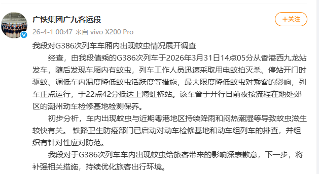 经查,由广九客运段值乘的G386次列车于2026年3月31日14点05分从香港西九龙站发车,随后发现车厢内有蚊虫,列车工作人员迅速采取用电蚊拍灭杀、停站开门时驱蚊、调低车内温度降低蚊虫活跃度等措施,最大限度降低蚊虫对乘客的影响,列车正点运行,于22点42分抵达上海虹桥站。该车曾于开行日前夜按流程在地处郊区的潮州动车检修基地检测保养。