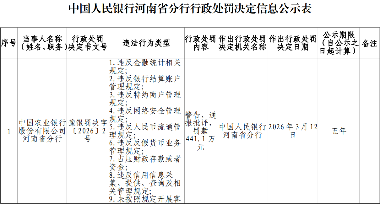 【大河财立方消息】4月3日消息,中国农业银行(601288)河南省分行因11项违法行为,被中国人民银行河南省分行警告、通报批评,罚款441.1万元。