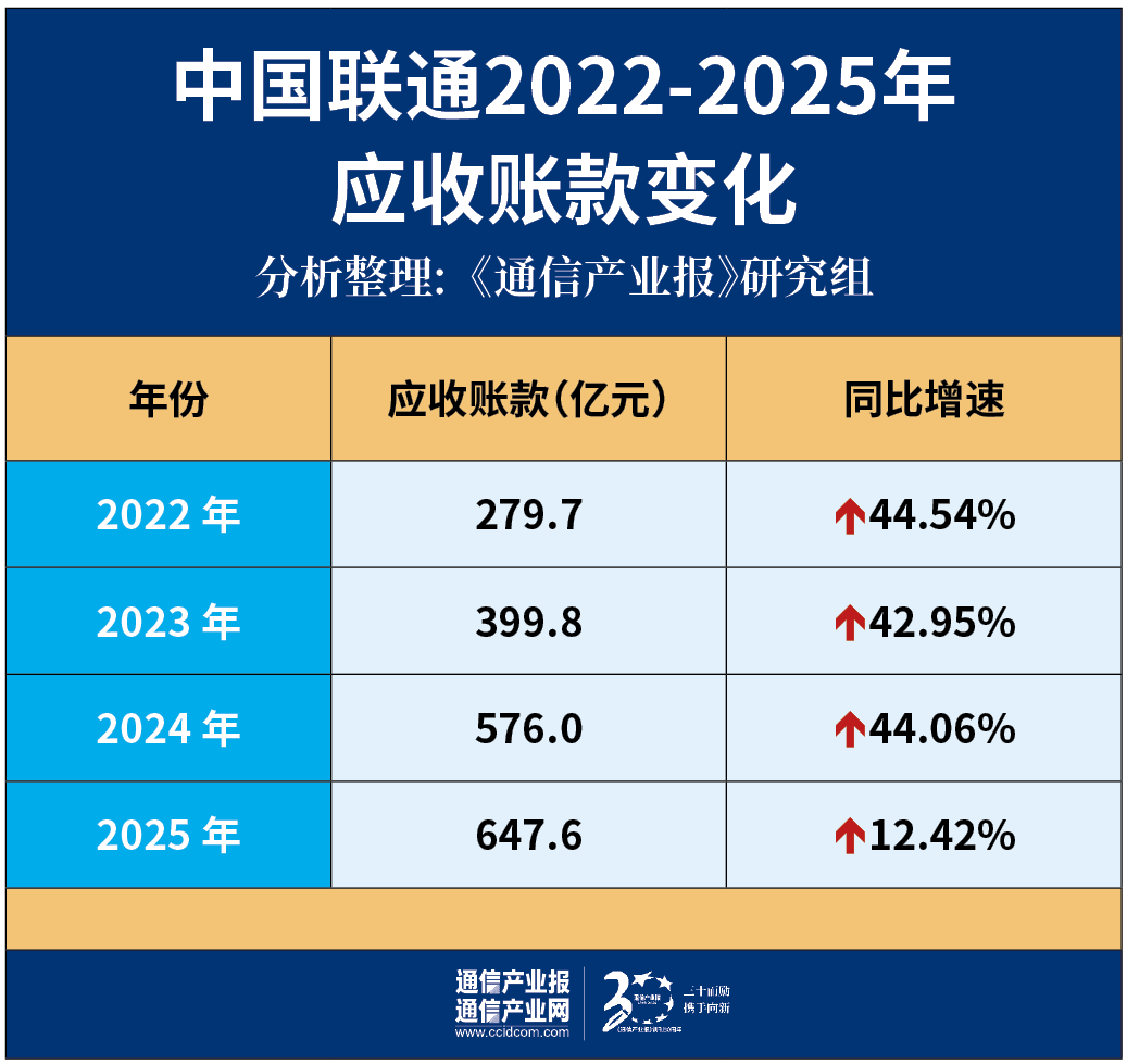 应收账款方面,中国联通在2025年也创出新高,其中,中国联通2022—2025年,应收账款分别为279.7亿元、399.8亿元、576亿元、647.6亿元,同比分别增长44.54%、42.95%、44.06%、12.42%,虽然创出历史新高,但增速已明显趋缓。
