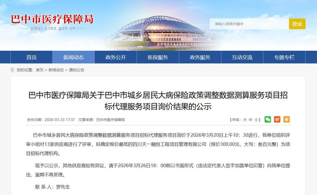 3月25日,有参与巴中市医疗保障局招标代理遴选的机构在网络发帖称,巴中市城乡居民大病保险政策调整数据测算服务项目的招标代理服务,以300元“低价”成交。