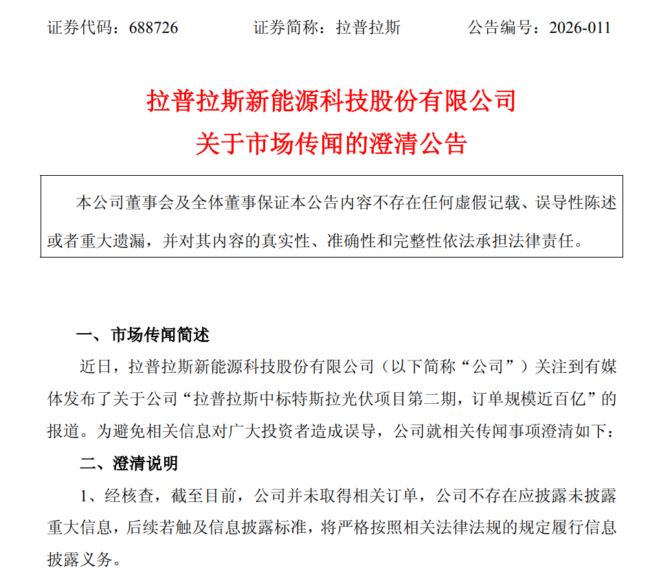 拉普拉斯称,经核查,截至目前,公司并未取得相关订单,公司不存在应披露而未披露的重大信息,后续若触及信息披露标准,将严格按照相关法律法规的规定履行信息披露义务。