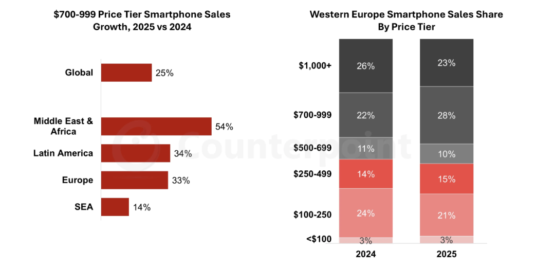 2025 年的一大重要趋势是平价旗舰机型(批发价 700–999 美元)的增长。在全球范围内,该价位段是 2025 年增长最快的细分市场,销量同比 2024 年增长 25%。这一增长主要由三大区域驱动:中东与非洲、拉丁美洲和欧洲,2025 年增速分别达到 54%、34% 和 33%。东南亚同样增长强劲,该价位段同比增长 14%。西欧尤其成为该细分市场的核心区域,2025 年平价旗舰手机已成为当地最受欢迎的品类,占据近 30% 的市场份额。