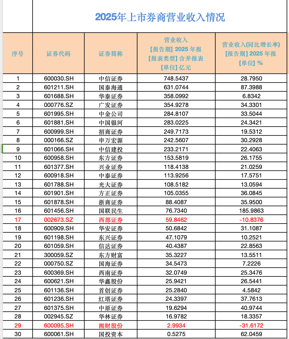 央广网北京4月3日消息(记者 樊瑞)截至4月3日下午4时许,已有30家上市券商披露2025年年报。除西部证券(002673)和湘财股份(600095)两家营收下滑,其余28家券商均实现营收与净利双增。其中,国泰海通成为总资产最大的券商。暂居次席的中信证券(600030)在营收、净利润、投行和国际业务等诸多核心指标中仍位居第一,尤其营收和净利润分别为748.54亿元和300.76亿元,显著领先于国泰海通等竞争对手。