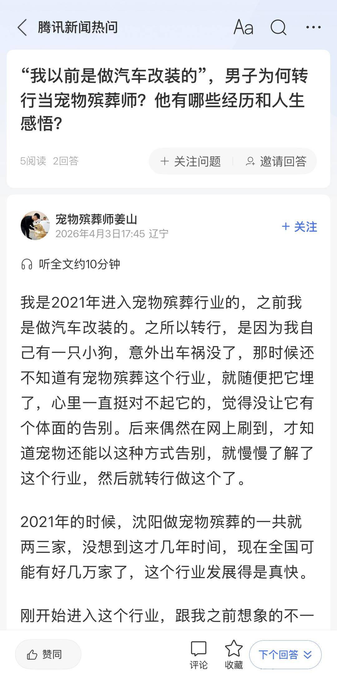 随着宠物经济的持续繁荣,宠物早已成为许多家庭不可或缺的一员,而宠物殡葬这一承载着思念与告别的行业也随之兴起。宠物殡葬师姜先生在腾讯热问发帖,讲述行业背后的故事,和他遇到的主人与宠物的“特殊告别”。