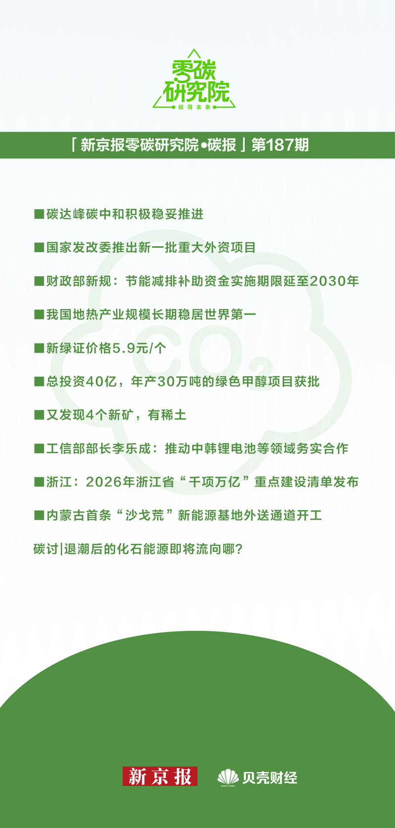 零碳解读:报告同时提出了2026年的主要任务,包括全面实施碳排放双控制度、单位GDP二氧化碳排放降低3.8%左右、开展“十五五”碳达峰行动、建立可再生能源消费最低比重目标制度等。