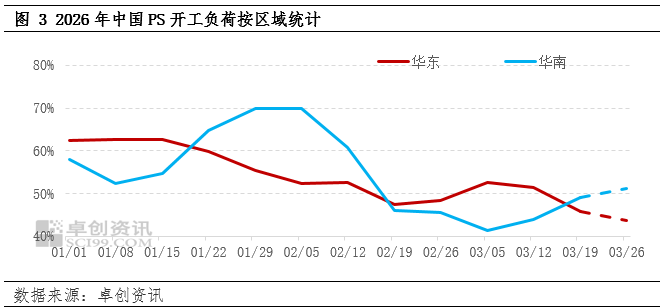 据卓创资讯调研数据显示,未来两周中国PS行业开工负荷仍存下降预期,预计至3月末,行业开工负荷将下降至40%-42%低位水平,主要减少量集中在华东、东北等地区。上游苯乙烯行业盈利状况尚可,考虑到更优的经济性,华东地区部分一体化企业倾向降低PS开工,增加苯乙烯的外销量,来获取更优的盈利效果;叠加部分计划内的检修,华东地区PS行业开工负荷预计从本周平均46%的水平下降至3月末当周的42%-43%。反观华南地区,少数企业装置春节后推迟复工,随着库存压力的下降,3月中旬开始逐步重启,行业开工负荷自43%提升至月末的51%上下水平,阶段性给华南地区贡献供应增量。