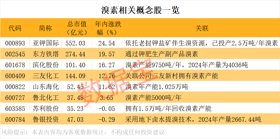 人民财讯3月27日电,进入3月以来,溴素市场迎来一轮迅猛的涨价潮。生意社数据显示,3月26日,溴素报价为6.31万元/吨,相比月初价格上涨52.78%,年内累计涨幅超75%。2026年初以来,溴素国际供应端接连出现扰动,美以伊冲突升级导致以色列化工集团 (ICL)工厂面临安全风险,ICL作为全球最大溴素生产商 之一,其产能占全球总产能的 33%,直接影响全球供应格局。此外,霍尔木兹海峡的封锁措施,进一步威胁全球溴素运输大动脉,加剧市场对供应短缺的担忧。生产企业方面,证券时报·数据宝根据公开资料梳理,亚钾国际(000893)拥有溴素产能2.5万吨/年,山东海化(000822)拥有产能超1万吨/年,苏利股份(603585)拥有回收溴素1.5万吨/年的产能,鲁北化工(600727)拥有产能5000吨/年,滨化股份(601678)披露2024年溴素产量为4036吨,鲁银投资(600784)披露2024年度生产溴素2667.44吨。