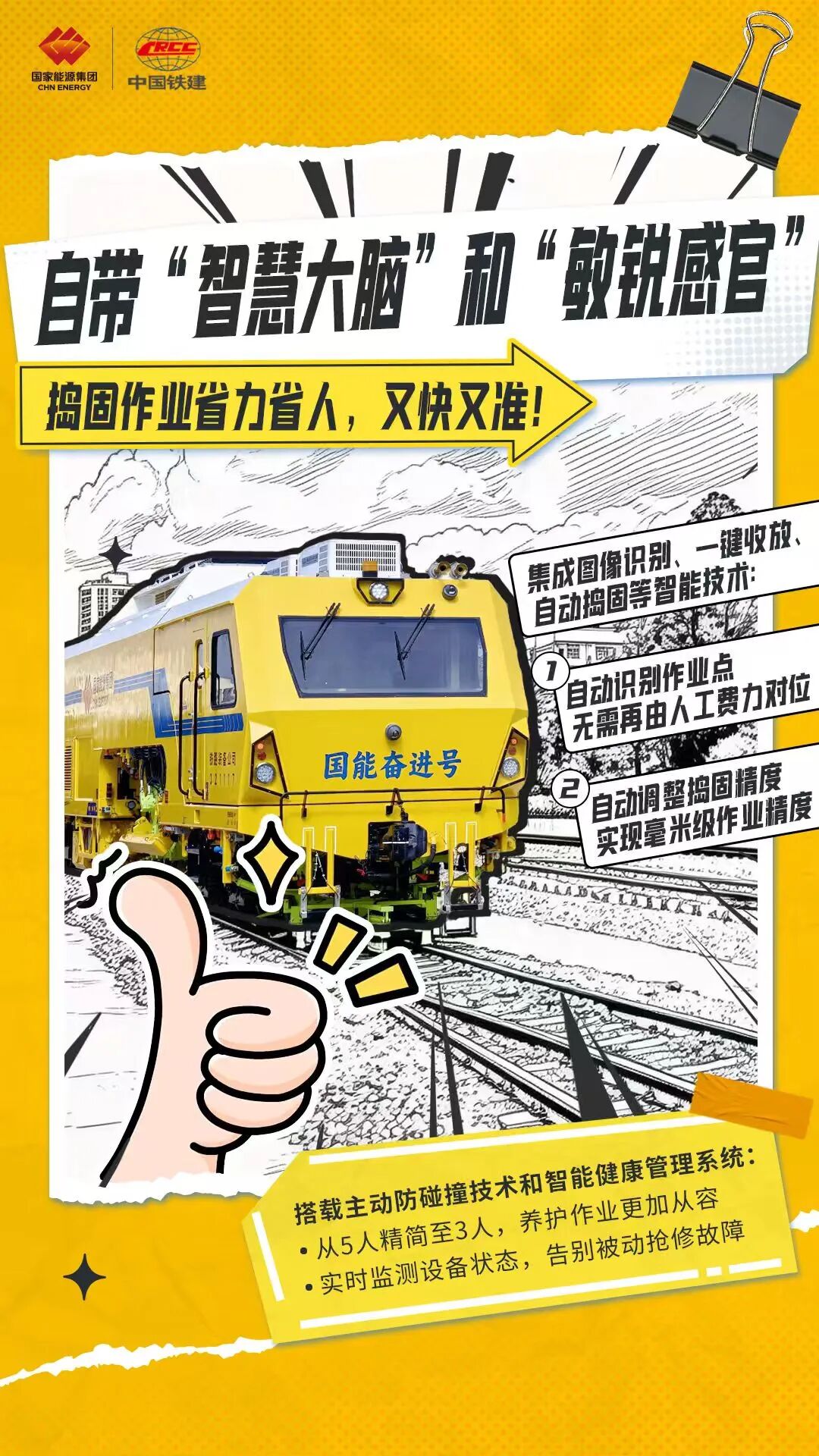 不仅动力先进,这台设备还像“开了挂”一样智能,相当于给传统的捣固车装上了“智慧大脑”和“敏锐感官”。它集成了图像识别、一键收放、自动捣固等智能技术,不用人工精准对位,设备能自动识别作业点、自动调整捣固精度,作业精度达毫米级,捣固作业又快又准,大大降低了对人工经验的依赖。