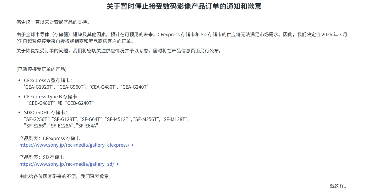 索尼在公告中表示:“感谢您长期以来对索尼产品的支持。由于全球半导体(存储器)短缺及其他因素影响,预计在可预见的未来,CFexpress存储卡及SD存储卡的供应将无法满足市场需求。因此,我们决定自2026年3月27日起,暂时停止接受授权经销商及索尼商店客户的订单。关于恢复接单的时间,我们将在监控供应情况的同时进行考虑,并将在产品信息页面另行公告。”